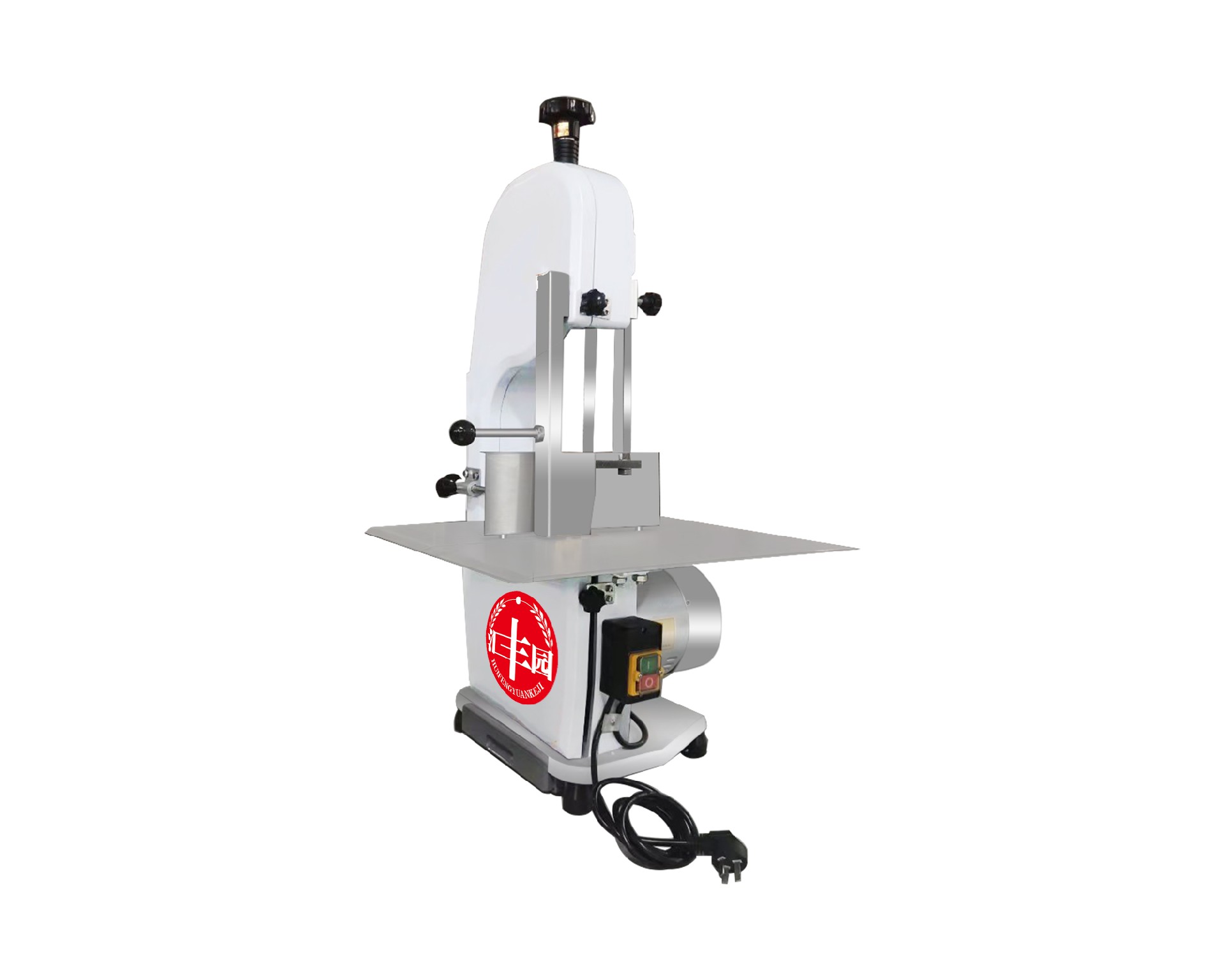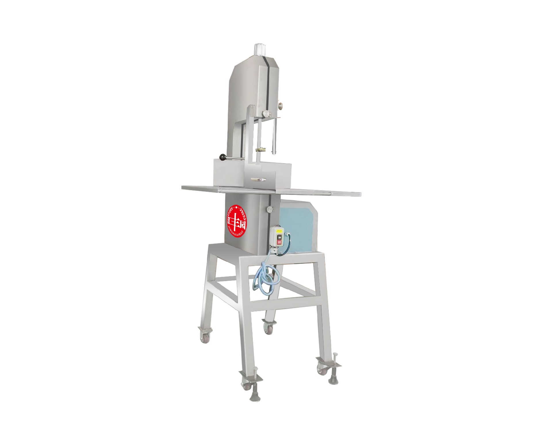 平面式機身設(shè)計, 不銹鋼封板, 符合食品衛(wèi)生并易于清洗;不銹剛機門, 表面特殊處理, 容易清理及保養(yǎng);鋸帶壓力張緊裝置, 便于鋸帶安裝及調(diào)整;鋸帶穩(wěn)定裝置, 鋸切時鋸帶穩(wěn)定不會游走 .厚度調(diào)整板加強設(shè)計, 便于調(diào)節(jié)加工厚度, 移動時不會搖動. 適用適用于各類中小型動物骨頭、冷凍肉,帶魚骨,冷凍魚,冰塊的加工等。用于小塊凍肉、排骨的切割。適用于大型集中式食品加工廠、屠宰場、肉聯(lián)加等地使用。